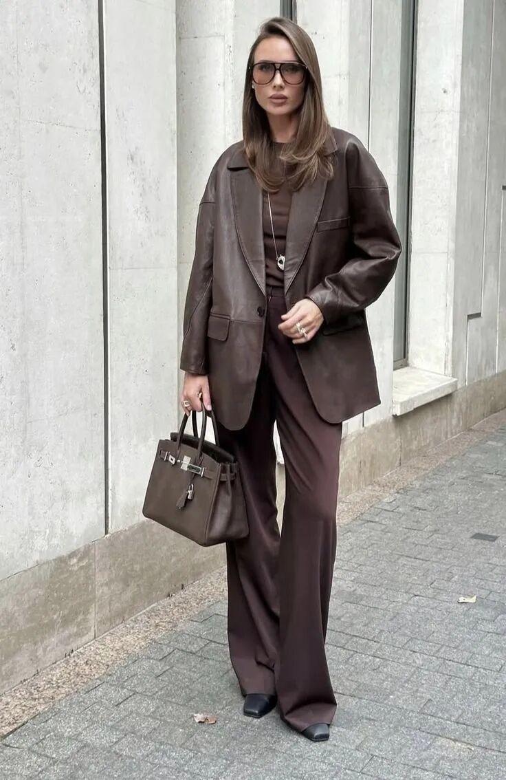 颜色推荐大地色系,好比黑色皮西装,搭配任何单品都显得沉稳可靠,又好比深棕或赤褐色,穿上身搭配大地色系单品更添层次感。