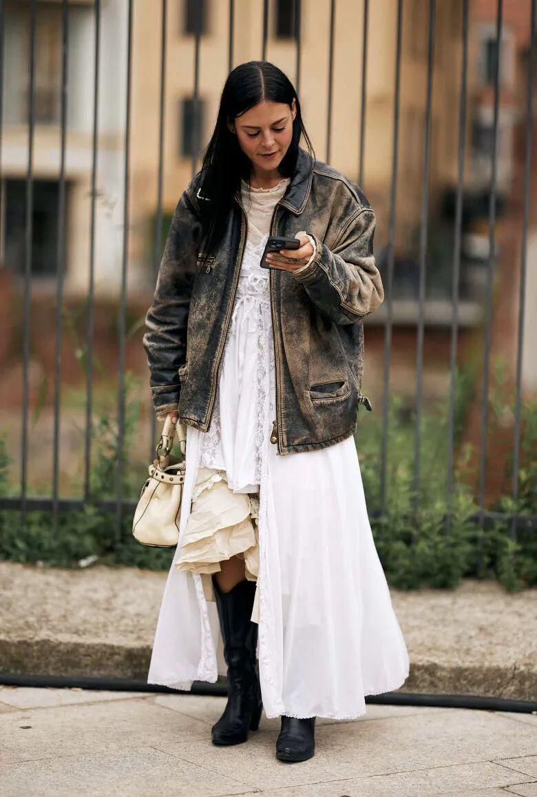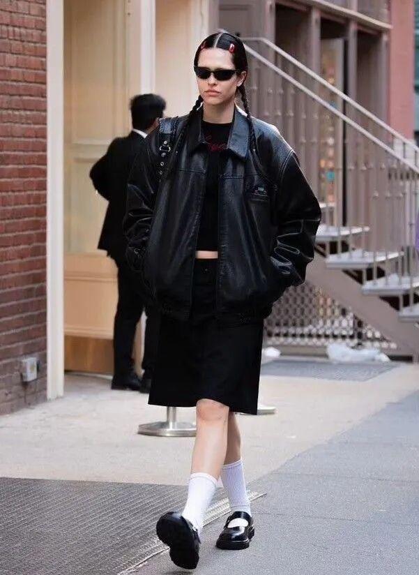也可以搭配俏皮减龄的单品,让皮夹克也穿出年轻的朝气。
