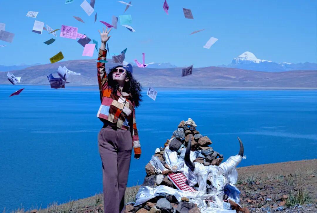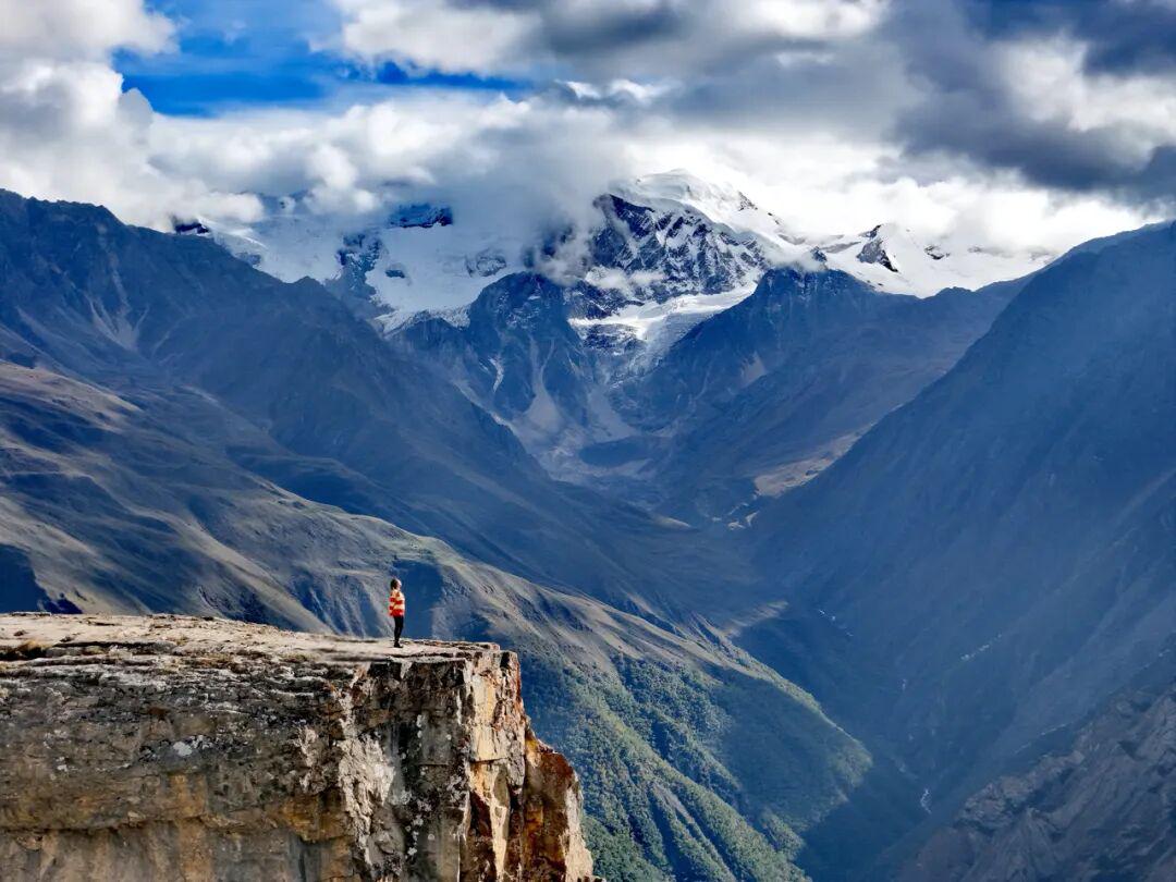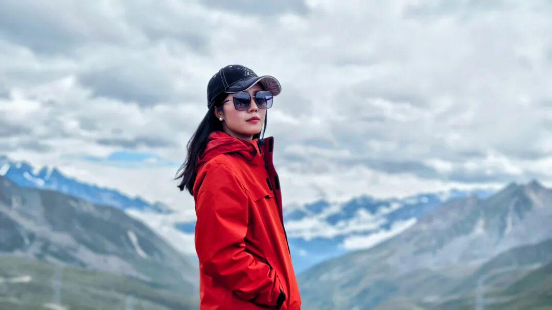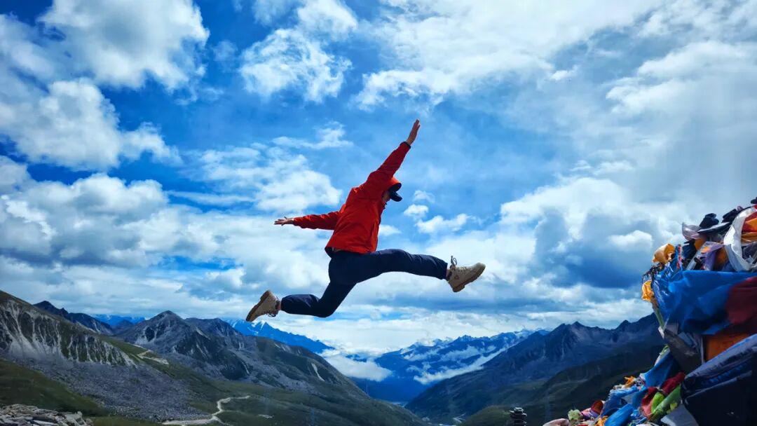 心上栀子:四川甘孜州折多山(康巴第一关)318国道旁的壮美景致。身着红衣,在4348米高海拔处停留、跳跃、眺望,雪山、经幡为背景,尽显自由与自然之美。▼