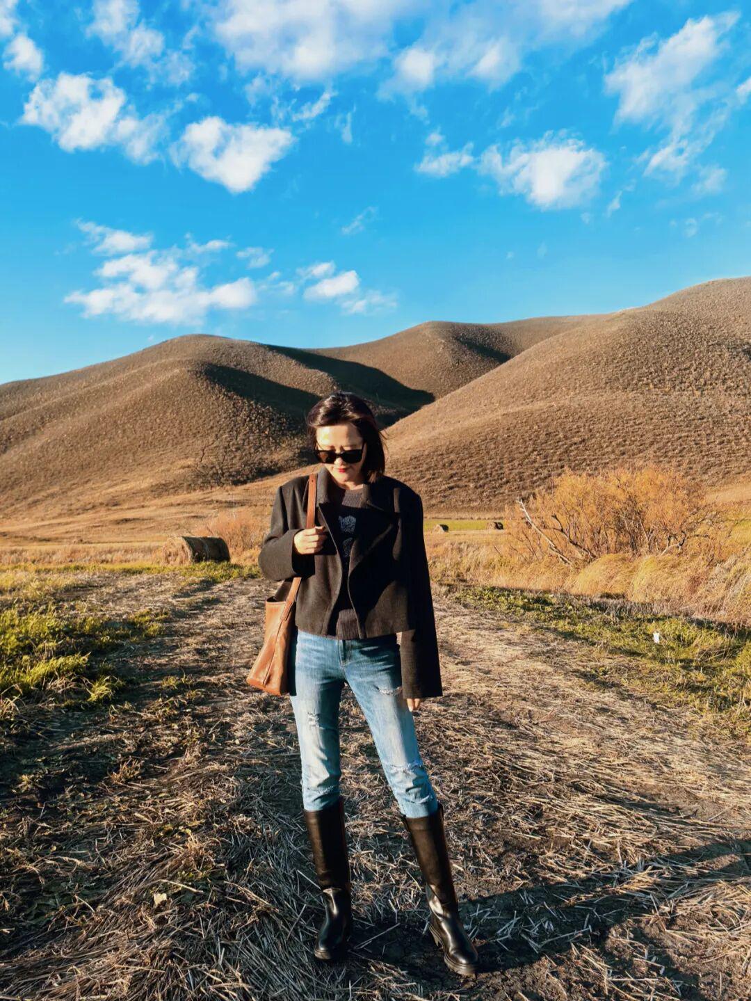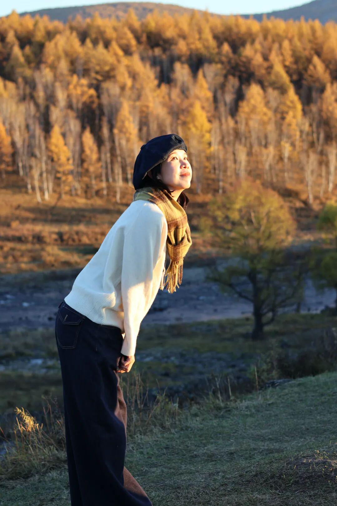 赏秋穿搭的一个思路:穿大地色系,和自然风光的美融在一起。 如果不想挑战大面积棕色,用包包或者围巾等配饰也能有氛围——