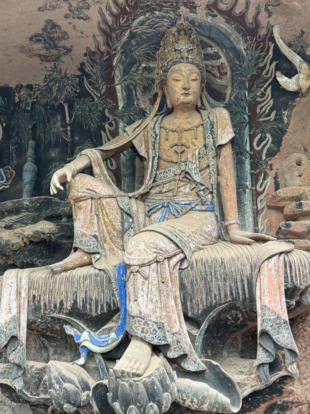 Soar:中秋来到安岳毗卢洞北宋紫竹观音,本名水月观音,因石刻前方有个小水池,十五的月亮必会投射其中反射月光到观音身上形成光晕。可惜历史上被填平且左手被破坏后复修,远没有右手珠圆玉润,故被称为“东方维纳斯”。▼