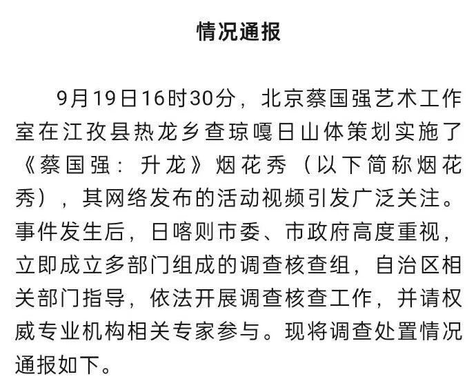 15日,官方通报蔡国强烟花秀调查情况。通报中称,目前日喀则市已委托开展生态环境损害赔偿鉴定评估工作,根据生态环境损害调查情况,依法追究北京蔡国强艺术工作室生态环境损害赔偿和生态修复责任,日喀则市相关部门将开展长期监测和后评估工作。“始祖鸟”品牌作为此次活动的赞助商,依法承担相应的生态环境损害赔偿和生态修复责任。