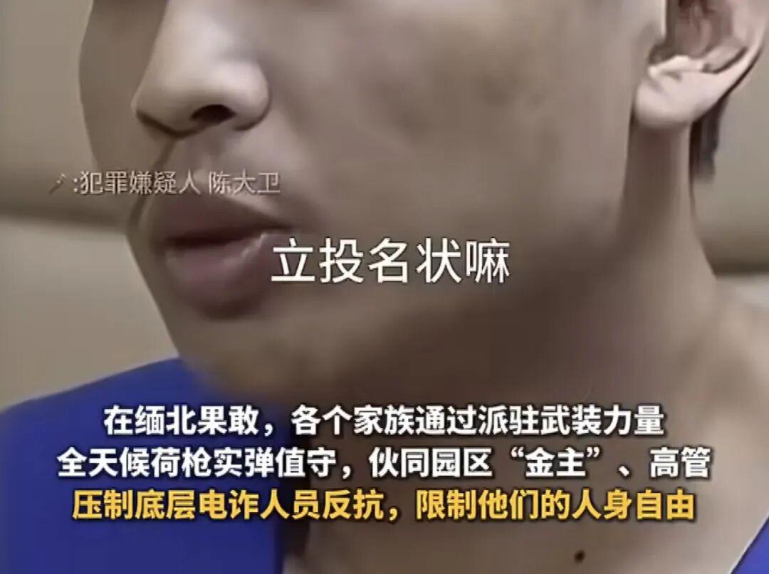 在缅北果敢,各个家族通过派驻武装力量,全天候荷枪实弹值守,伙同园区“金主”、高管,压制底层电诈人员反抗,限制他们的人身自由,对未完成诈骗业绩、违反管理制度或试图逃跑的电诈人员进行体罚、拘禁或暴力殴打,这几乎已经成为各诈骗园区的管理常态。缅北魏家犯罪集团,有自成体系的政、军、商“铁三角”。魏家兄弟的外甥陈大卫掌控边防营的军事力量,草菅人命、残暴无比,背负多起中国公民的血债。有园区金主提出想与陈大卫结拜兄弟时,陈大卫为了“仪式感”,会“随便找个陌生人”“杀人祭天”。因不服园区管教被关禁闭的马某德就不幸被选中,被推向所谓的“祭天台”枪毙。陈大卫还曾枪决与自己有过纠纷的金主手下游某标,他浑身都有被开枪射击的痕迹,头盖骨上就有7个弹孔。一个个生命被随意戕害,陈大卫却满不在乎:“需要有什么感受吗?”“就让你们中国的法律来制裁我吧。”