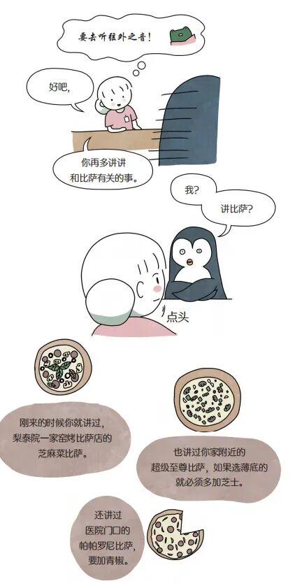 企鹅小姐抑郁后热衷于吃比萨,因来到首尔上大学时首次吃到比萨觉得难吃被人嘲笑,她认为“津津有味地吃比萨是一件很棒很有品位的事,我好像觉得我当然要去这么做。”仅仅因为在意他人想法,我们又吃掉了多少“比萨”呢?