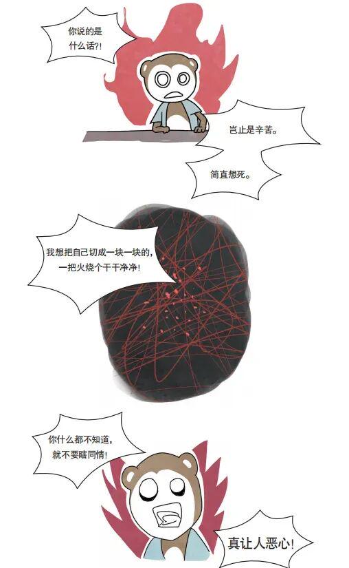 因抑郁而厌食总是催吐的猿美,体重一直在下降甚至危及到生命,她说:“现在我已经不知道什么是还好了。我也不知道自己是不是曾经还好过。心里一直很堵很闷。”