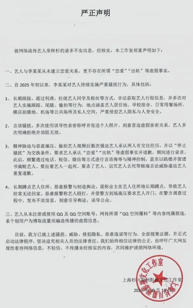 那份声明,写得义正言辞,滴水不漏。通篇看下来,荣梓杉简直成了一个被恶女持续骚扰、精神控制、以死相逼的白莲花。