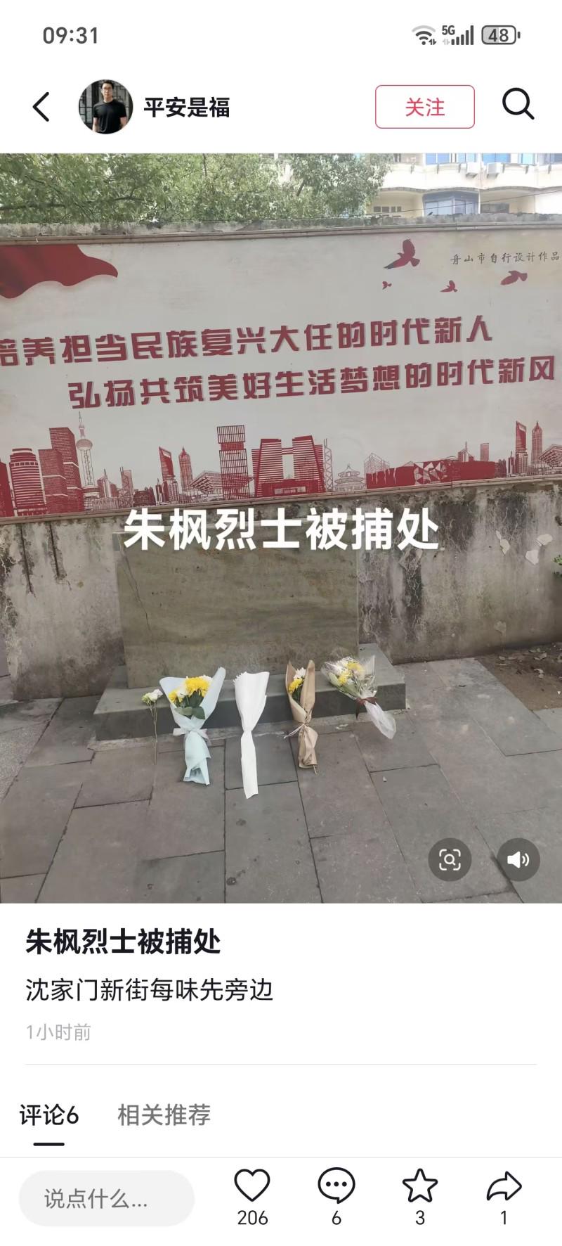 当地居民胡女士说,自己就住在(朱枫烈士被捕处)对面,这里来往的人很多,“本来我就知道这里有一个碑,我还特地去找了她的事迹,电视剧看了,更加为之所动。我们舟山解放,跟朱枫烈士、吴石将军有很大的关系,应该来献个花。”