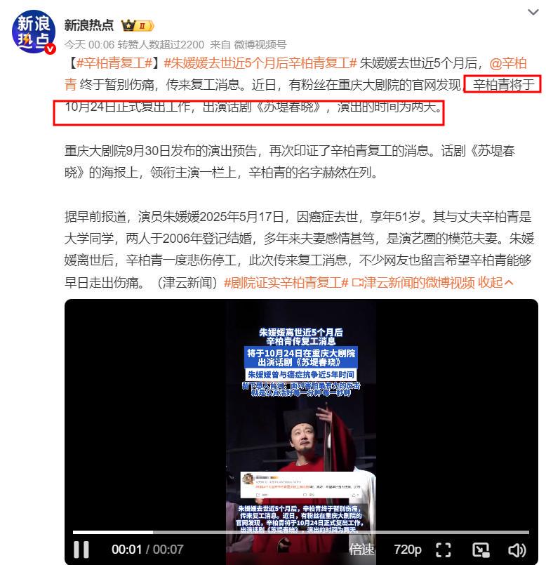 这也就是说辛柏青依旧暂停工作,依旧沉浸在丧妻之痛中。