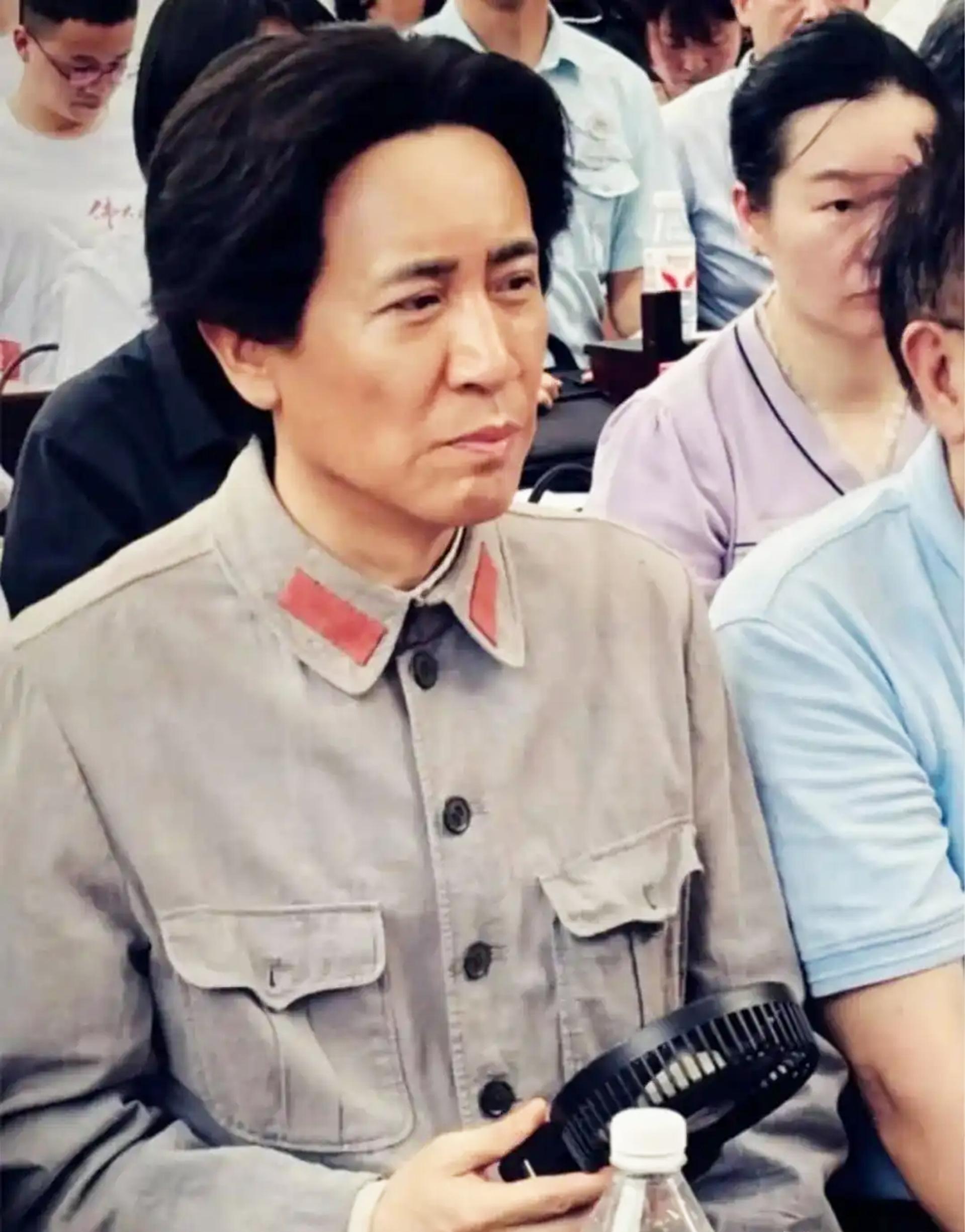 从流出的剧集发布会现场视频看到,何政军的发型换成了小平头,眉毛也加粗了,使脸部看起来更接近朱德。