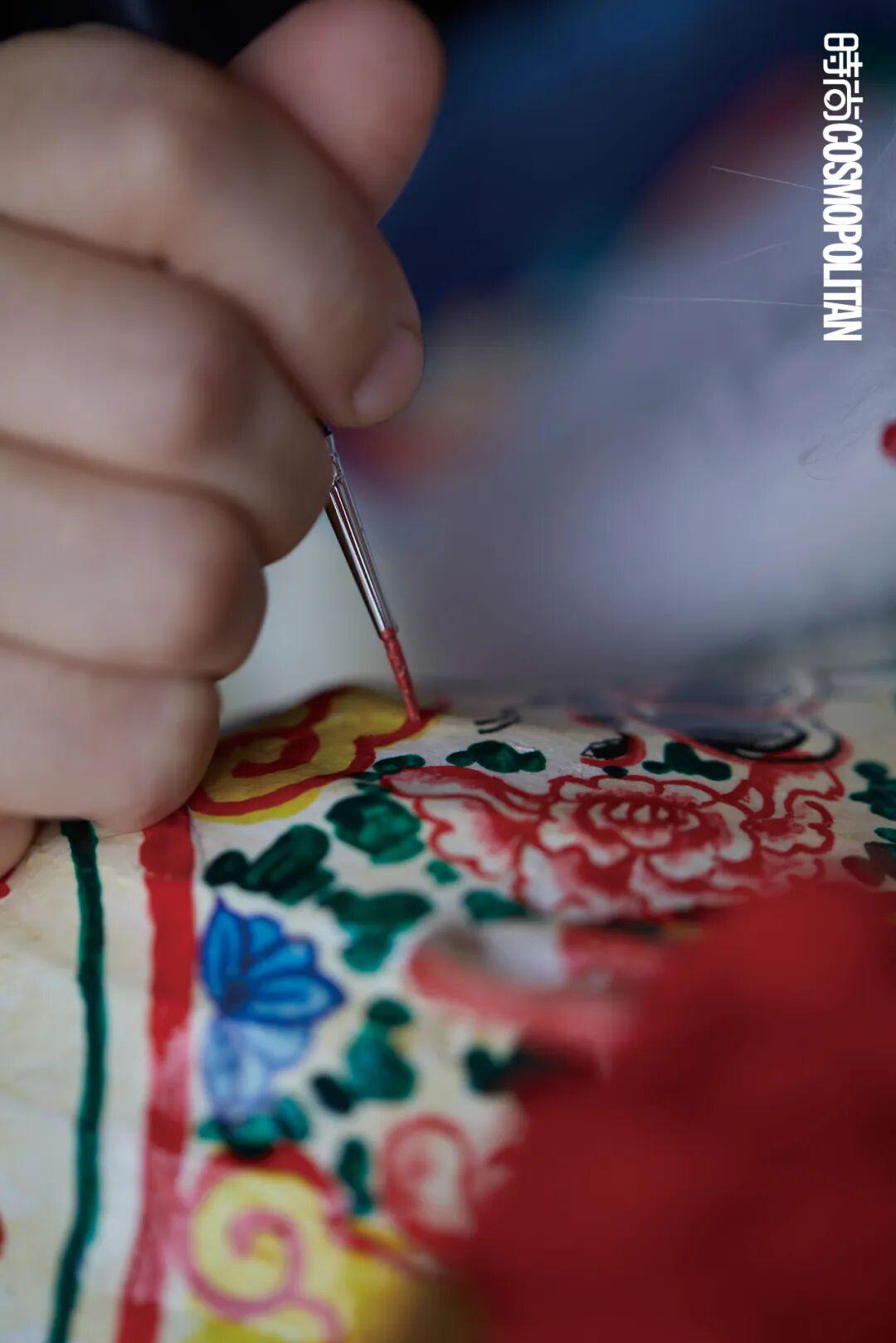 骨有了,便要添皮。宣纸撕开蘸糨糊,一片片贴上去,须贴三层以上。空气弥漫着糨糊的气味,糊得太薄会裂,太厚则闷。风干后,纸面收紧,粗糙转为温润,手指触到那种质感,仿佛纸张在呼吸。蔡贝如第一次完整糊完时,心口一阵发热,她觉得这头纸扎的麒麟忽然有了“生气”。最后是彩绘。底色常为白或黄,用来提亮。其上画牡丹、桃花、菊花、蝴蝶,皆寓意吉祥。红、黄、蓝、白、黑五色并用,对应金木水火土。嘴边绕金线,寓意为金口玉言;颈椎的小彩灯寄托“麒麟送子”的盼望。师傅刘金星的手稳得惊人,几十年下来,笔触干净利落,从不重描,弟子蔡贝如曾在一旁数,师傅能一气画出47朵花,无一犹疑。那是身体里的节奏,不靠思索。