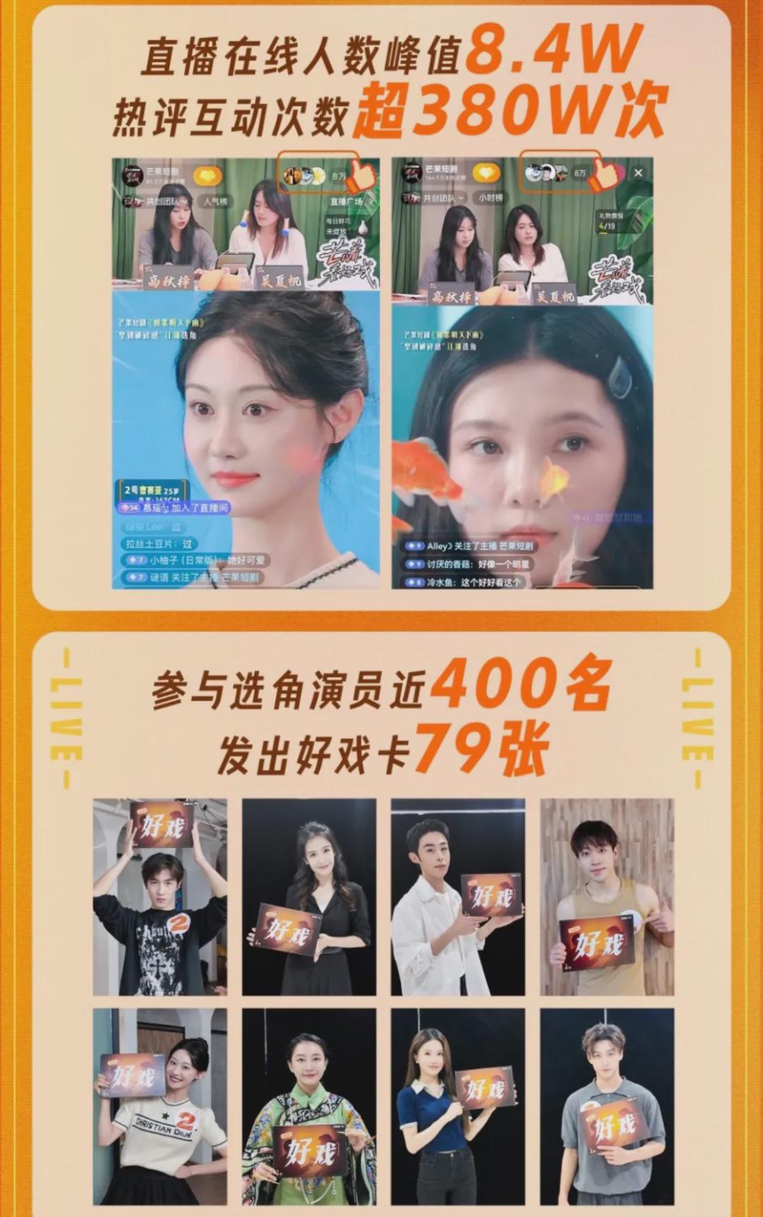 而且我们高黏性粉丝生态也在逐渐形成,直播间观众会主动讨论演技与角色适配度,在直播结束后依旧在评论区不停催更。我们也正在规划为“好戏卡演员”在芒果TV站内孵化他们的创新内容,拓展新的观众群体。