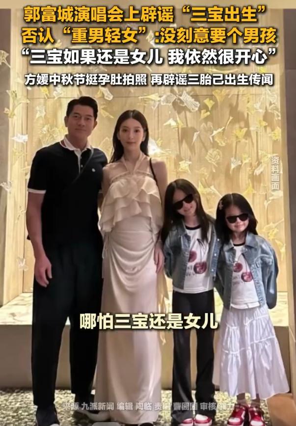 对于此,郭富城多次回应过,在这次回应之前,在成都演唱会时他也否认了重男轻女,当时他说从来没有刻意追求生儿子,“都是我的孩子,我都是那么地爱。再生一个三宝是女儿,我也很开心啊!”