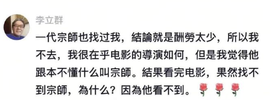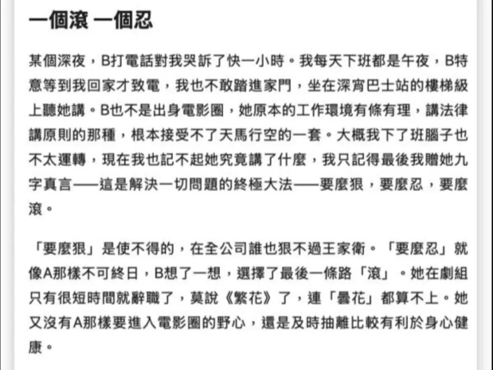 因《繁花》在2024年拿下白玉兰最佳编剧(改编)奖、金鹰最佳编剧奖的名编秦雯,也在社交媒体发文:面对“造谣诽谤”,已立案。同一时间,古二的个人发文账号遭到屏蔽,文章不再可见。其实早在2023年,古二已经在该账号里发过指名道姓的维权内容,并未引发广泛关注,直到提及明星,事件才酿成一场风波。于是前几日,他又在小红书账接连发布数条录音内容,时长共计长达一小时,涉及上文多位知名演员,直接爆上了热搜。事一出,不少人讨论古二爆料对隐私权的侵害,大部分网友则是表示理解。一方面,每一段录音都标注为“工作纪要”,对话是否发生在公开场合目前是不清楚的。另一方面,贵圈压榨编剧这事看起来太真了,不少编剧博主证实:看见这一维权事件内心毫无波动,很常见。甚至2024年1月,《明报》便有报道称王家卫在剧组苛待另一位女性编剧,当事人因为饱受打压和否定,患上抑郁症。“导演不愧和导师一样,都姓导,做事风格也一样哈......”目前署名权风波还悬而未决,古二已背上几个名誉权官司。向太大谈王家卫拍电影坑制作人往事,曾不看好《繁花》的李立群在起评论区加料:“一代宗师也找过我......我觉得他根本不懂什么叫宗师。”说实话,古早影迷圈里真有些嫡嫡道道的氛围,王家卫的滤镜太大太厚,既有奖杯傍身,谁敢多说几句?直到他开黄腔、说怪话等等一面曝光,署名权风波又没回应清楚,到此时沉默的螺旋才开始发声。对于王家卫,作品看不看得明白的还另说,可对他多年来在剧组的“暴君美名”,大众真可谓是熟悉至极了。无固定剧本,无固定周期,灵感来了就拍,灵感无了就等。为了拍到他想要的一个镜头他不惜牺牲任何人的精力、时间和尊严,也不惜把所有对他有期待的人拖下水。网友笑称,他在没有AI的时代,把片场打造成了大模型,给演员输入指令,然后一遍遍调试。“没有灵感怎么办,用穷举法啊,拍它几万条,总能挑出不错的。”