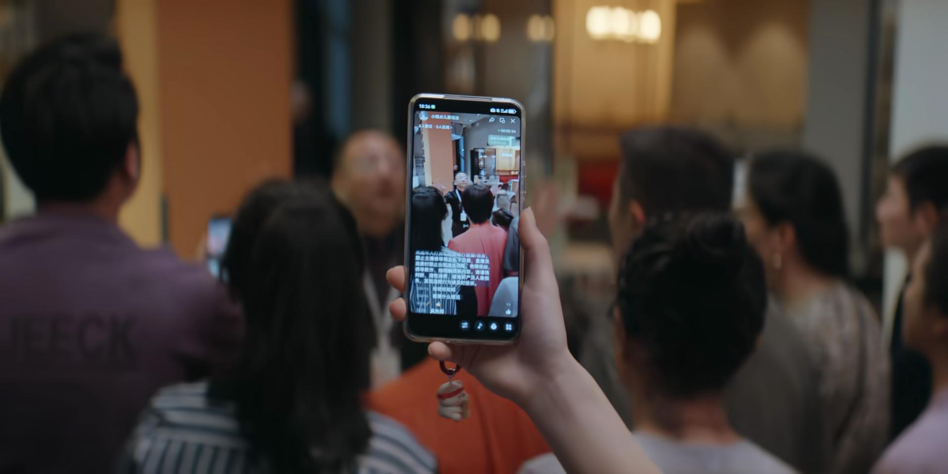 人群中看热闹的另一位选手郭小雨(何蓝逗饰)当场拿出手机拍下来,把视频发到了自己小号上。