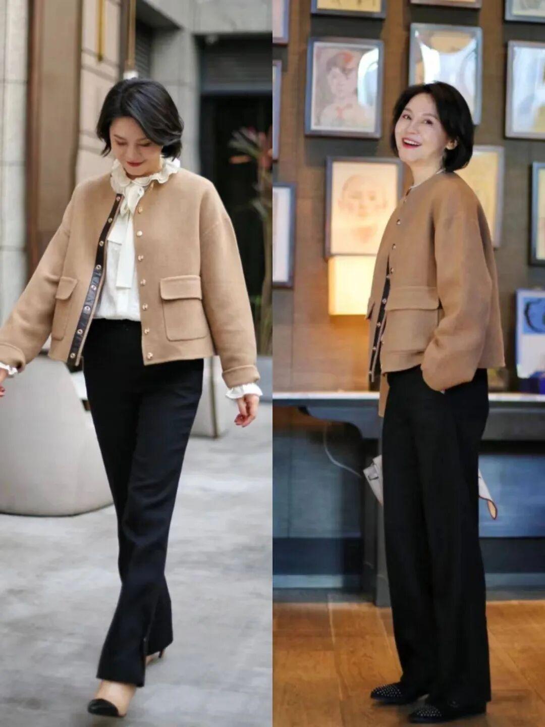 此外,腰线也是很重要的,比例不好的中年女人可以尝试上短下长的搭配方式,拉高我们的腰线,上半身穿短款廓形外套遮肉,下半身用阔腿裤拉伸比例,谁穿谁有气质。