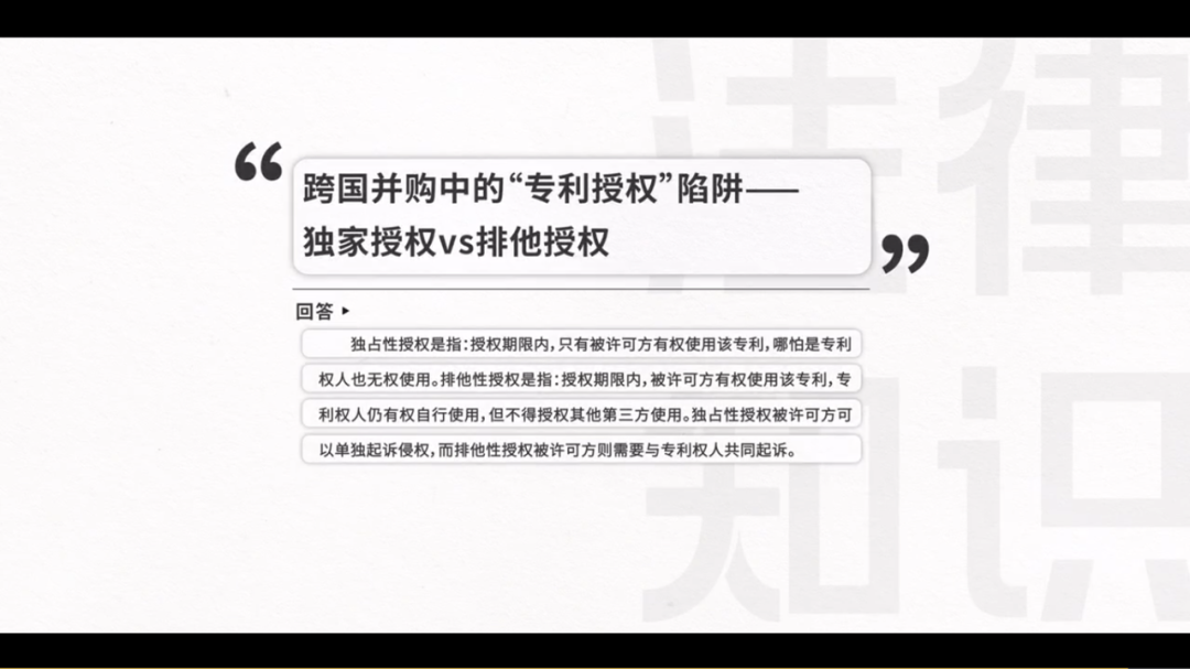 值得一提的是,这部剧每一集中间、结尾都会给出本集涉及的法律知识科普。比如这一集结尾就科普了“跨国并购中的‘专利授权’陷阱——独家授权vs排他授权”。