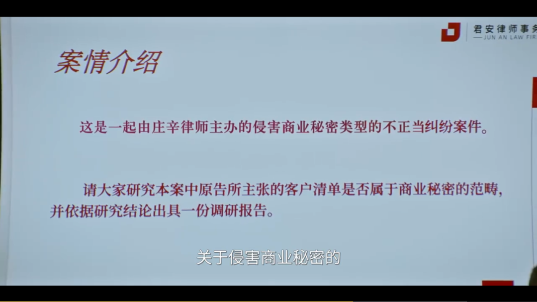 在第2轮的第1次考核任务中,律所主任庄辛带教的三位实习生接到的便是一起商业秘密案件,要求就原告主张的客户清单是否属于商业秘密出具调研报告。(不过这里的PPT似乎少了不正当竞争的“竞争”二字,剧组扣。)