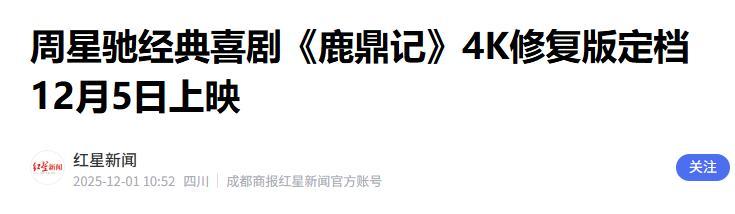 红星新闻2025-12-01周星驰经典喜剧《鹿鼎记》4K修复版定档12月5日上映