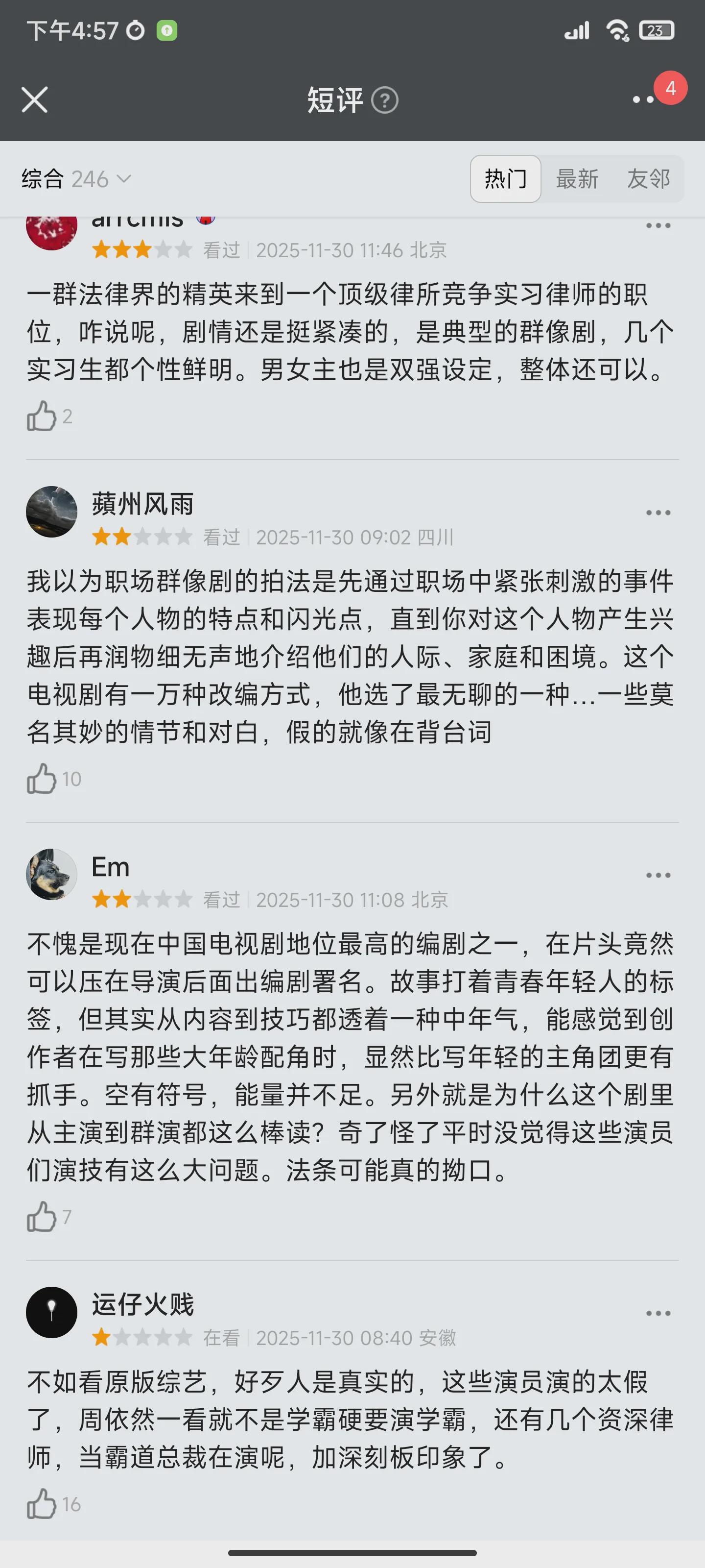 没有律所会这样,台词基本不是正常人生活里能发生的正常对话了,莫名其妙的情节和对白,假得像背台词,剧情刻板得像念PPT。从导师到实习生,个个都很装。尤其是女主周依然,好明显的背台词,板着脸没底气。