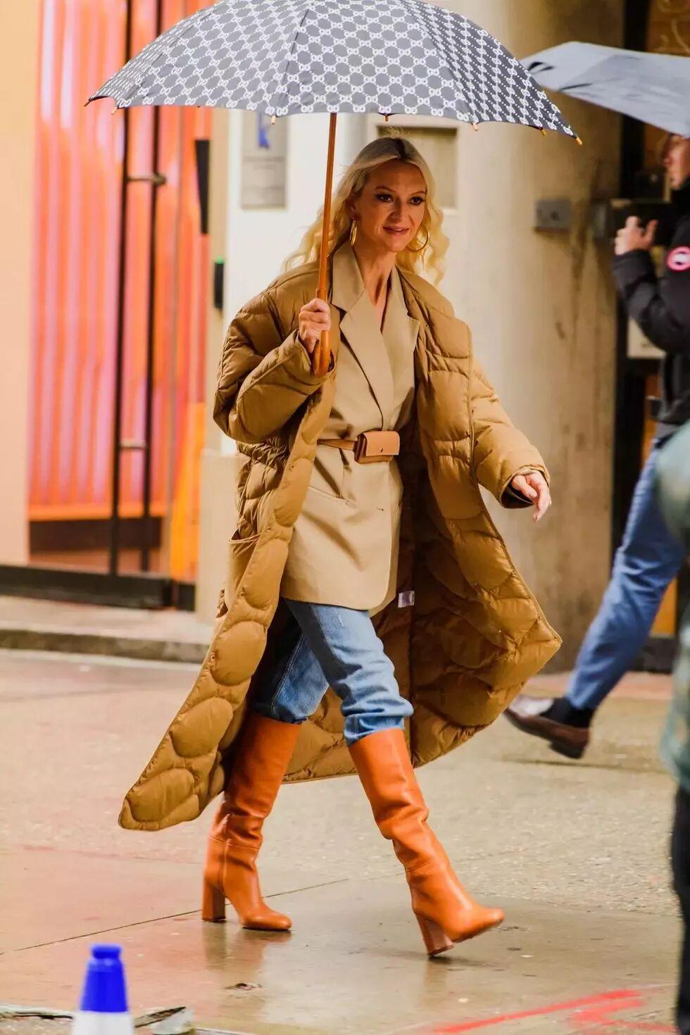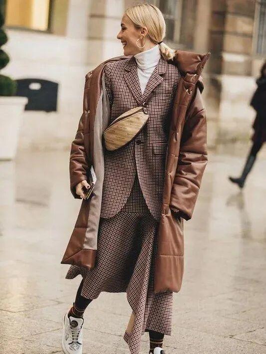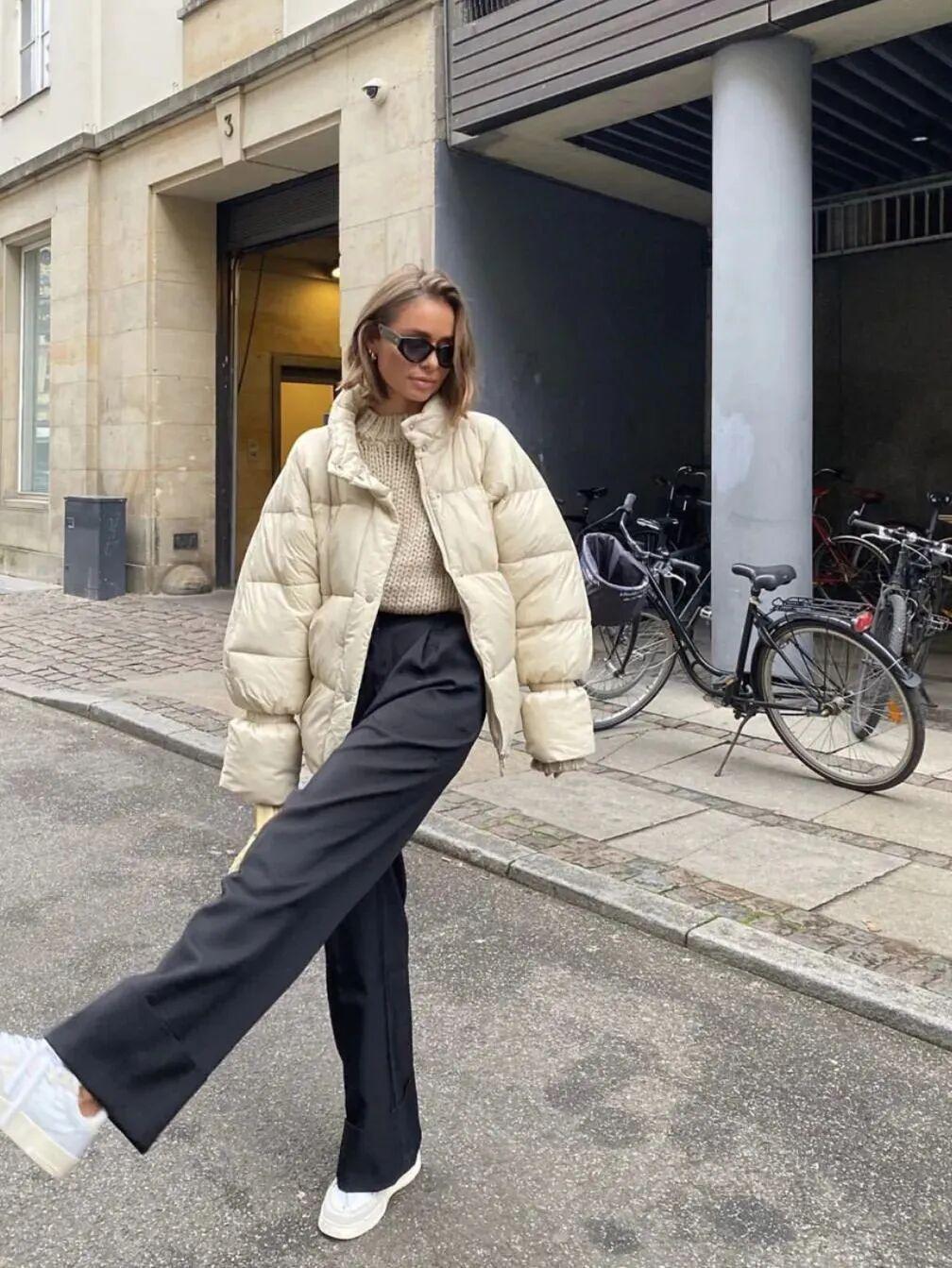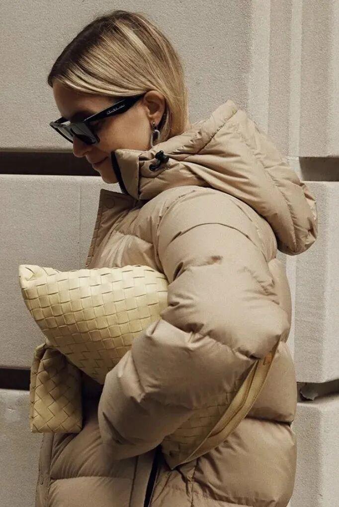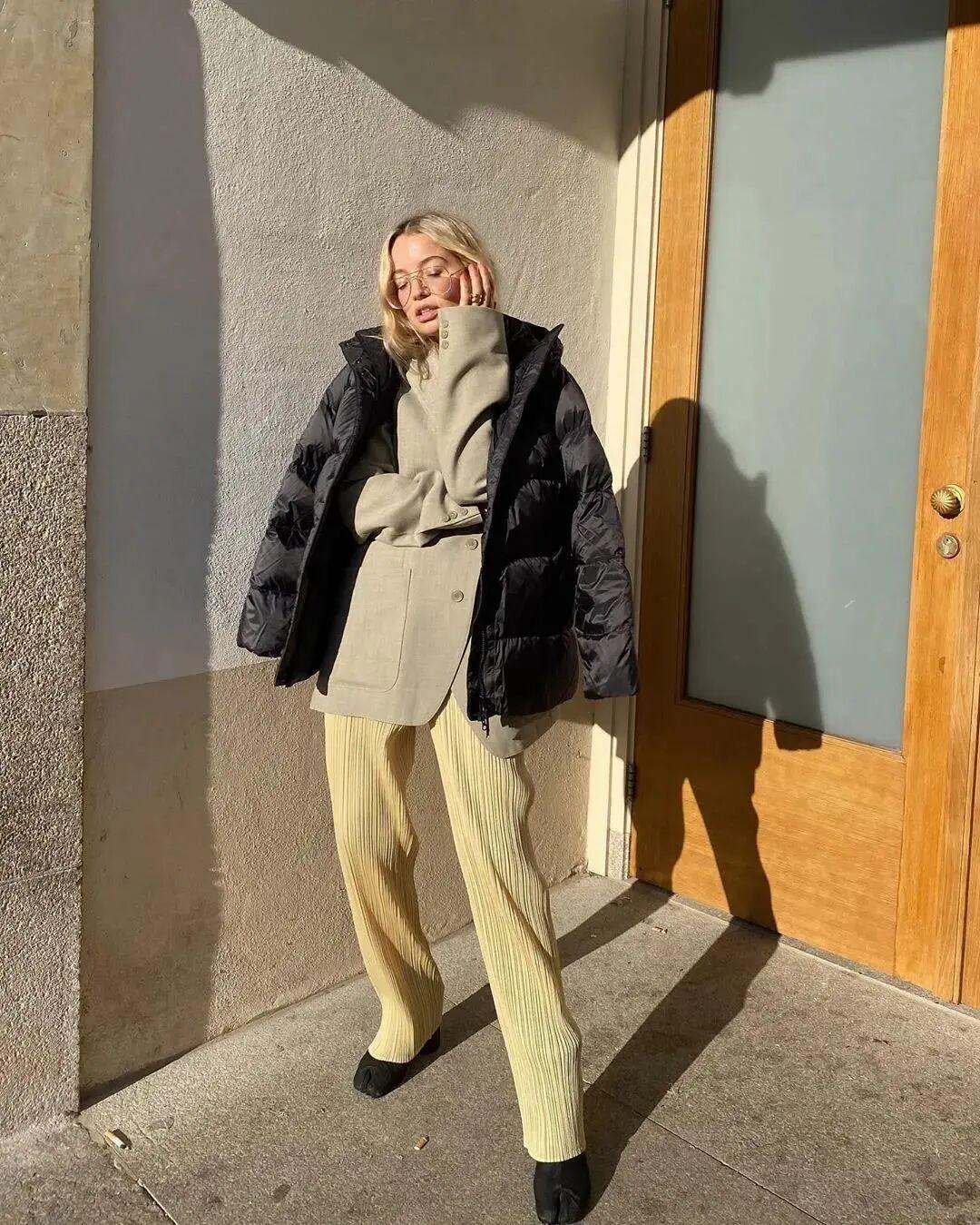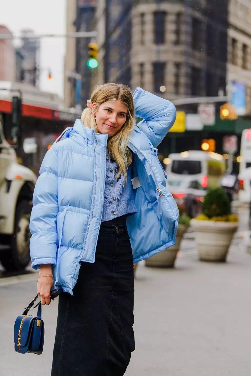 羽绒服,尤其是廓形的豆腐块式,在天气冷的时候再搭配一件毛衣,好暖,气质与温暖兼具。
