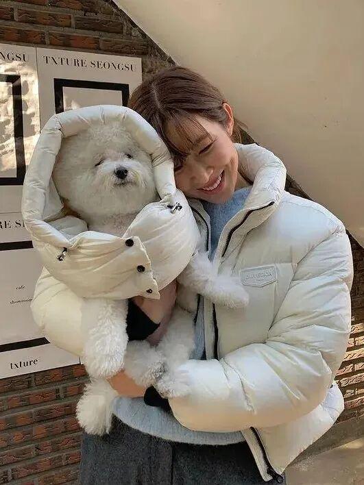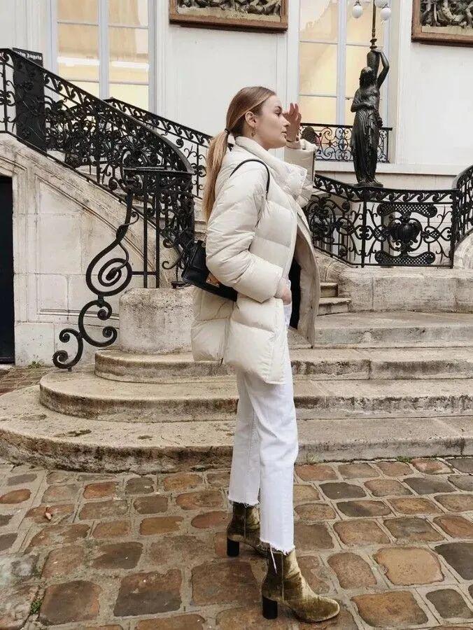 简单点,用同色的毛衣和羽绒服打造白色系look,摆脱慵懒笨重,穿出了一身轻盈优雅的感觉,很治愈~