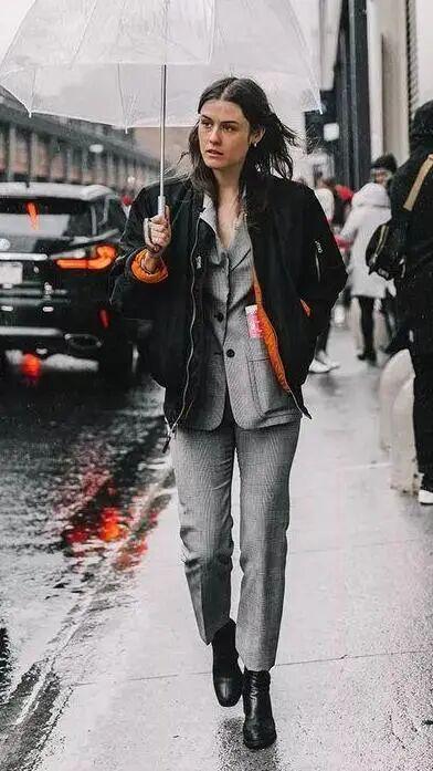 还流行一种穿法:将裤子的下摆塞进短靴里,酷girl必备。