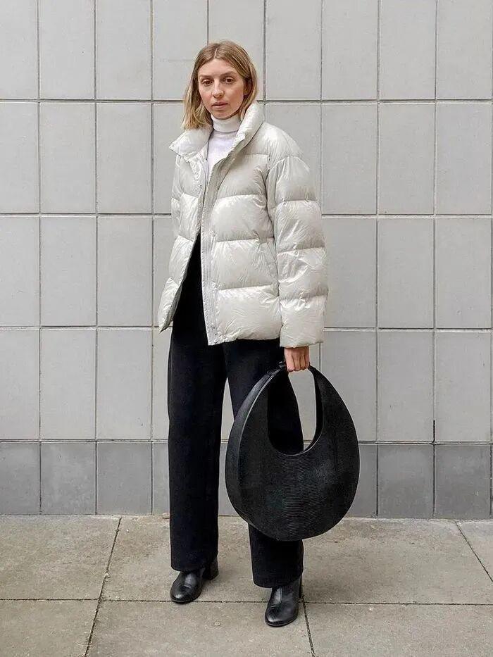 羽绒服和毛衣这个组合,S姐很喜欢黑白配色,经典又没什么限制,下身也很好搭,还可以点缀毛线帽、墨镜或者金属项链等首饰,时时刻刻都不失精致。